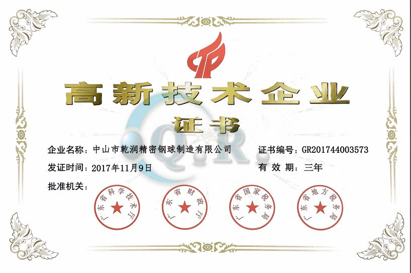 中山乾潤(rùn)精密鋼球再次獲得高新技術(shù)企業(yè)榮譽(yù)稱號(hào)