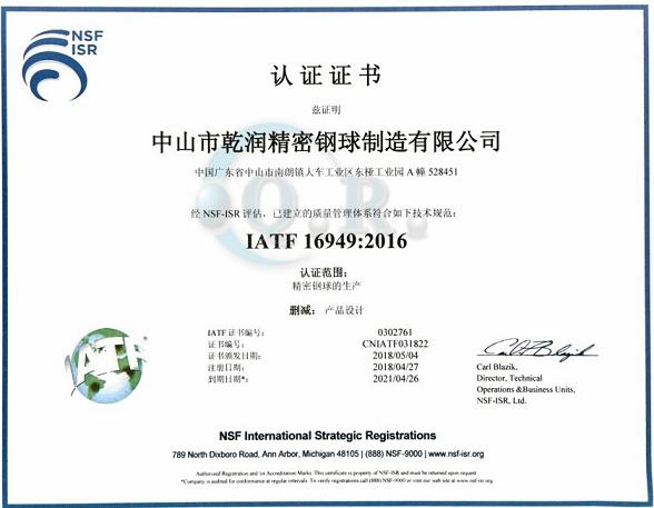 | 中山市乾潤精密鋼球制造有限公司ISO/TS16949:2009全新升級 | ||